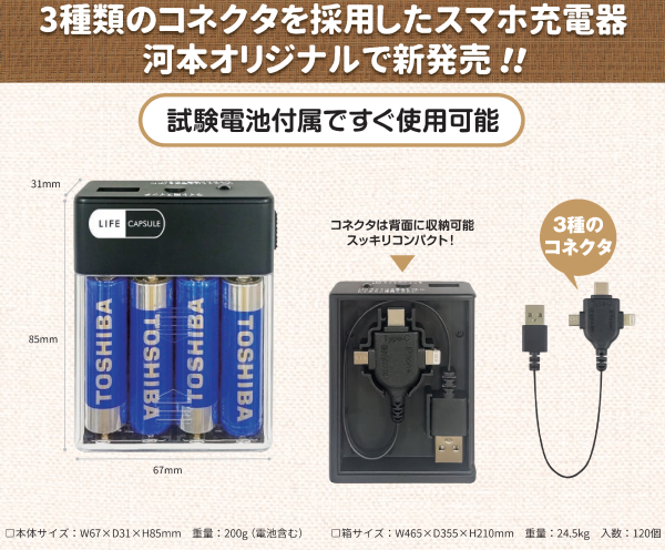 ◇3種類のコネクタを採用したスマホ充電器が河本オリジナルで新発売