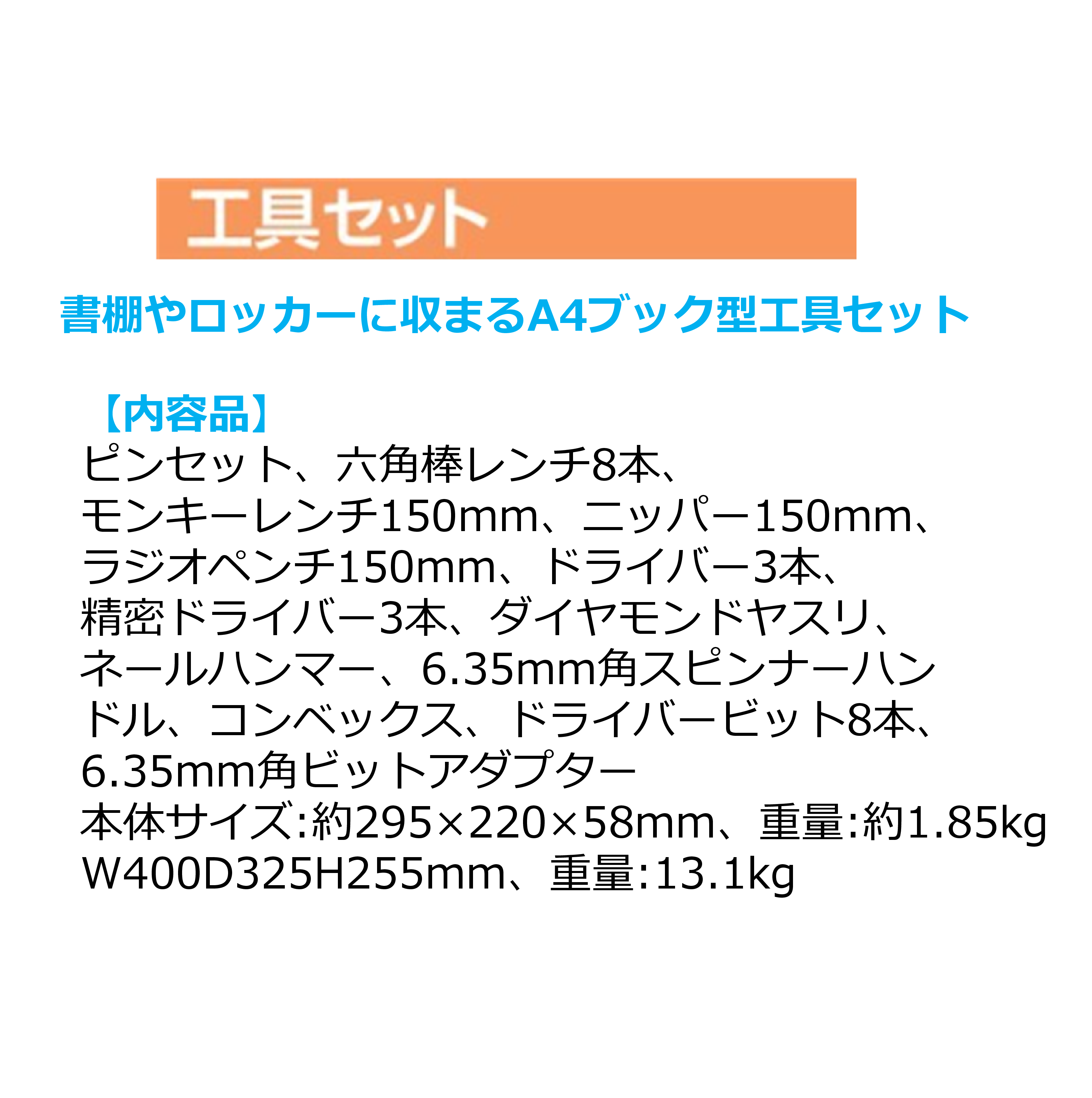 この工具セットは、A4サイズなので、デスクや本棚にも収納可能、